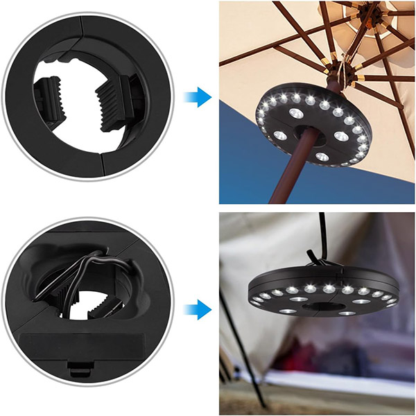 A diferencia de las luces de sombrilla estándar, BRELLAGLO funciona donde lo necesites. Sujétalo a una sombrilla para iluminar el patio o usa los ganchos incorporados para colgarlo, ideal para campamentos y aventuras al aire libre.